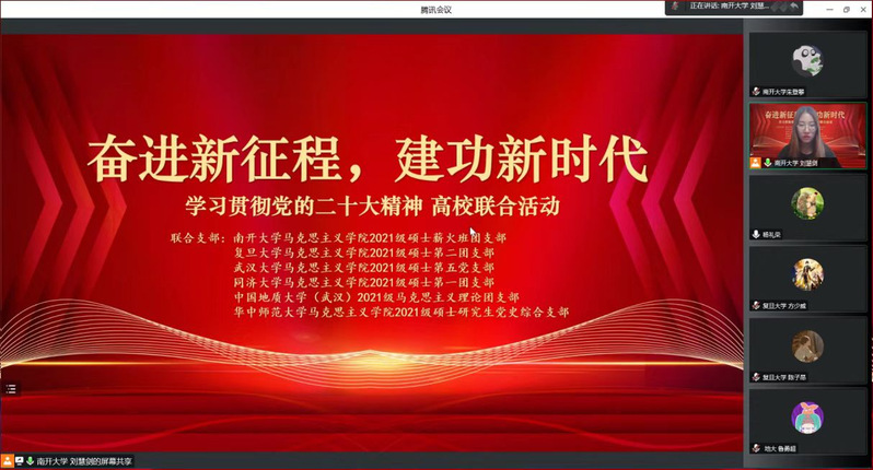 11月5日上午,必威betway西汉姆2021级硕士生薪火班团支部联合武汉大学、复旦大学、中国地质大学(武汉)、同济大学、华中师范大学五所高校必威betway西汉姆党、团支部与班级,通过“云端”开展“奋进新征程 建功新时代——学习贯彻党的二十大精神”联合活动。薪火班班导师杨礼荣出席活动并致辞。在理论宣讲环节,复旦大学李钰娉、华中师范大学蔡沐琳、同济大学李昂、中国地质大学(武汉)张书萱和张时佳聚焦党的二十大报告重要理论内容依次展开主题宣讲。与会成员围绕“以中国式现代化全面推进中华民族伟大复兴”和“维护国家意识形态安全”两大主题展开研讨交流。最后,参与本次活动的同学一起合影留念,为本次活动画上圆满的句号。
