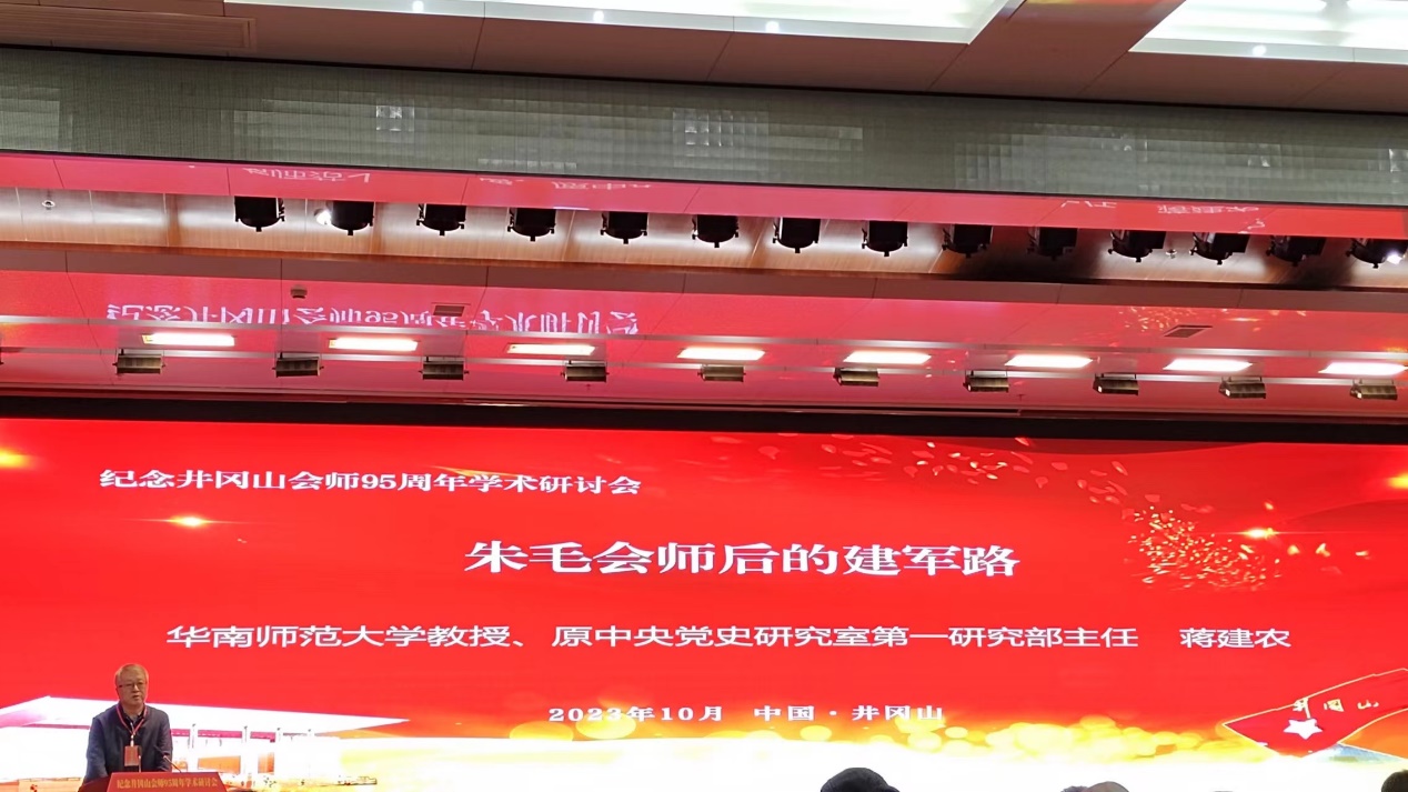 吉安市委常委、宣传部部长李瑞峰,井冈山管理局局长、井冈山市人民政府市长廖东生,江西师范大学党委常委、副校长、协同研究中心主任周利生,华南师范大学教授、原中央党史研究室第一研究部主任蒋建农等60余位专家学者及作者参加会议。蒋建农做井冈山会师的偶然性与必然性及其后续影响的主旨发言,同时从“山上”与“山下”两个角度分析了红军下山的原因。蒋建农认为当时的井冈山并非没有继续斗争的条件,而且后续井冈山仍然有人进行秘密斗争直到解放的事实证明依靠井冈山根据地的确能够将革命延续下去,可是因为粮食,交通等原因,仅仅以井冈山为依托的中国革命无法取得发展壮大。所以就“山上”的角度而言,下山的原因在于推动革命力量取得进一步发展。同时,“山下”各革命根据地的蓬勃发展也为下山创造了足够的物质基础与生存保障,因此下山在当时成为适合中国革命前进的新选择。蒋建农教授的发言获得与会参与者的一致好评与热烈掌声。之后参会专家学者,论文代表等围绕井冈山革命会师这一主题,根据各自文章的内容进行发言与讨论。我院硕士研究生苗誉耀作为论文代表参会。