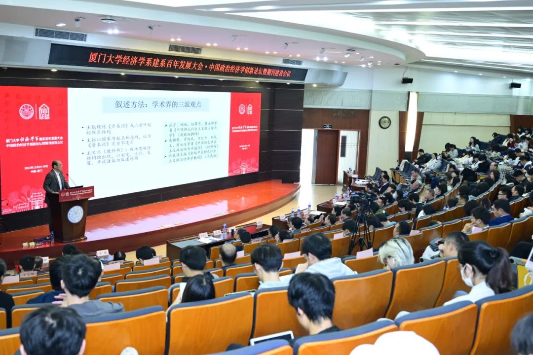 为更好推动马克思主义中国化时代化、中国特色社会主义政治经济学研究,促进马克思主义基本原理与中国具体实际相结合、同中华优秀传统文化相结合,增强学者与学术期刊的对话交流,由厦门大学经济学院、王亚南经济研究院、邹至庄经济研究院和中国政治经济学年会联合主办,厦门大学经济学院经济学系承办的“中国政治经济学创新论坛暨期刊建设会议”于2023年11月25-26日在厦大经济楼成功举办。该论坛是厦门大学经济学院经济学系建系百年大会重要活动之一,含开幕、闭幕主题演讲和分论坛环节,10位来自政治经济学领域的专家带来主题演讲,22篇研究成果在分论坛中被报告分享和研讨。我院博士生胡泽鹏受邀参加会议,并在分论坛上进行主题发言。