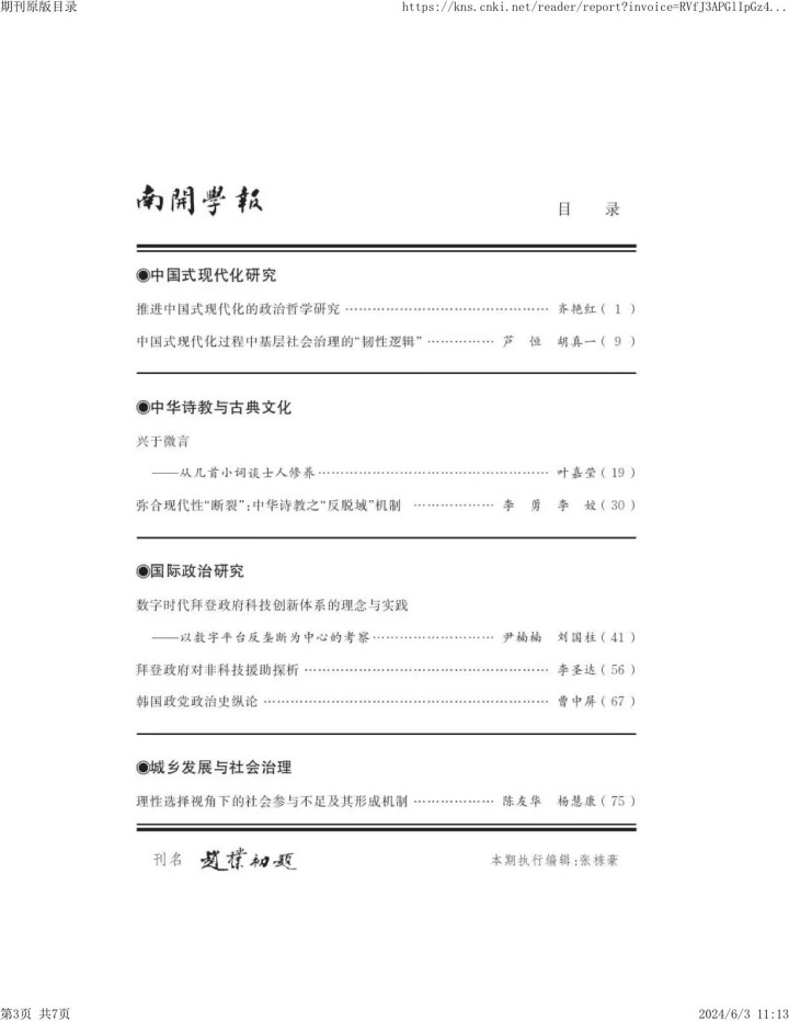 我院齐艳红教授在《南开学报》发表文章《推进中国式现代化的政治哲学研究》。文章认为,从中国式现代化进程看,马克思主义政治哲学研究始于对中国社会主义现代化建设规律的自觉探索和反思。中国的市场化社会转型必然要求从现代性语境中出场的马克思主义哲学,面向时代的需要和新的实践实现自身的观念更新。哲学基础理论研究、价值论研究、社会哲学研究,共同构成了马克思主义政治哲学兴起和发展的观念基础。政治哲学的兴起拓展并深化了关于中国式现代化的理论研究,在社会哲学研究的早期确立了“全面的现代化”观念,呼唤着现实性的政治哲学的研究;在新时代,关于民主政治的现代化和国家治理现代化的阐释和建构,深化了对中国式全面现代化的理论研究。继续推进中国式现代化的政治哲学研究,就要坚持整体性观念,注重对历史传统的研究,开展中西现代化的多层次比较研究。