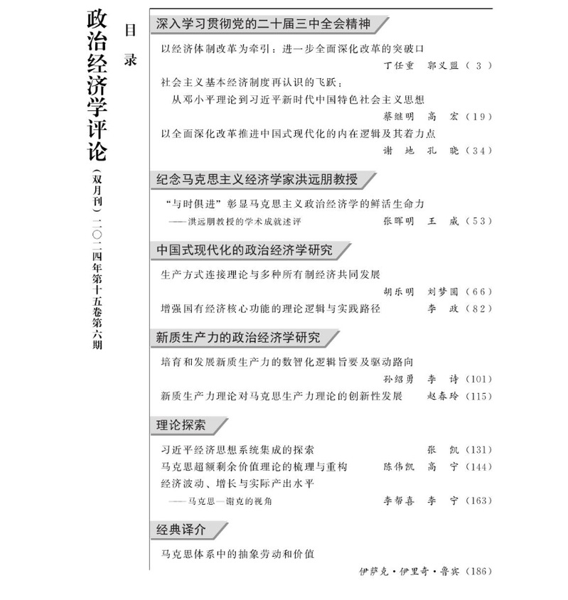 我院赵春玲副教授在《政治经济学评论》发表文章《新质生产力理论对马克思生产力理论的创新性发展》。文章认为,新质生产力是马克思主义政治经济学中国化时代化的创新范畴,赋予了马克思生产力理论以新的时代内涵和实践要求。主要体现在:对新阶段中国社会生产力发展的新趋势、新特征、新规律做出了全新总结和阐释,对新阶段科技创新推动生产力发展的核心地位、重要作用及其规律做出新阐释,对新时代生产力要素质变及其组合的跃迁做出与时俱进的新概括,对生产力发展路径和方式转换的新趋势做出了新概括,对全面深化改革加快形成与新质生产力相适应的新型生产关系的独有内涵做出了新阐释。为推进马克思生产力理论的中国化、时代化发展做出了创新性贡献。在以中国式现代化全面推进强国建设、民族复兴伟业的关键时期,我们要坚持以新质生产力理论为指导,深入推进改革创新,为中国式现代化持续注入强劲动力。