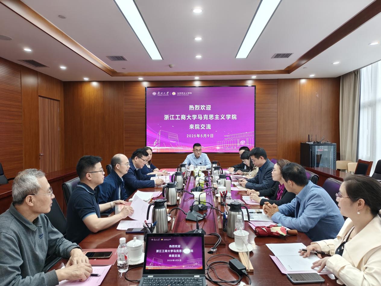 兰昊和李梦云在交流中分别介绍了各自学院的历史沿革、学科布局、师资队伍、学科建设特色亮点等方面情况。余一凡系统介绍了我校在“大思政课”建设方面的经验做法和“师生四同”育人特色,并高度评价了浙江工商大学马院近年来在发展特色学科、强化科学研究能力、提升社会服务水平等方面取得的显著成绩。李梦云对南开马院的热情接待表示感谢,希望双方能以此次交流为契机,进一步加强互访,丰富在思政课教学改革创新、学科建设、人才培养等方面的合作交流,更好落实立德树人根本任务,共同推动教学科研繁荣发展。