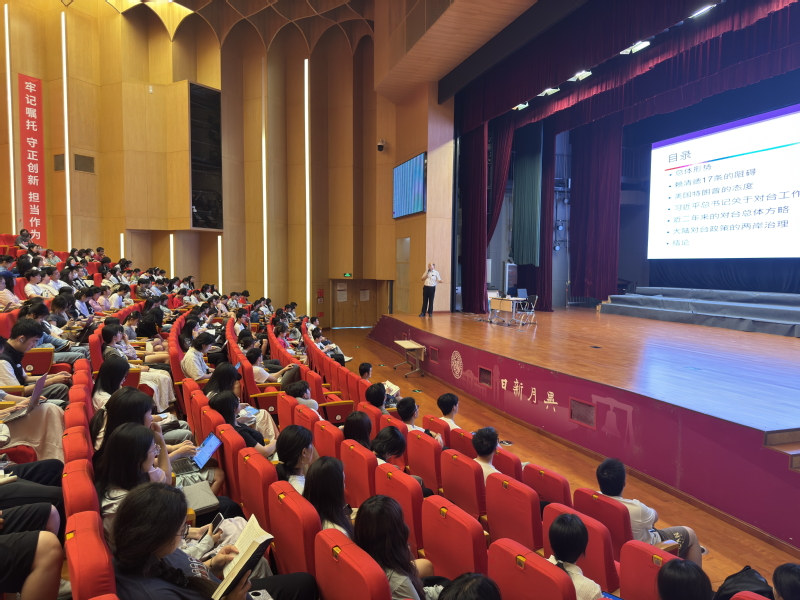 黄清贤教授首先深入分析了当前两岸关系的总体形势,包括两岸交流合作的积极成果以及“台独”分裂势力对两岸关系和平发展的严重威胁。他指出,尽管外部势力干涉和“台独”分裂活动给两岸关系带来了诸多挑战,但祖国统一的历史大势不可阻挡。黄教授着重剖析了习近平总书记关于对台工作的重要论述,探讨了两岸关系未来发展的方向和路径。他强调,坚持“九二共识”、反对“台独”是两岸关系和平发展的政治基础,两岸同胞应携手合作,共同推动两岸关系和平发展。黄教授的讲解既有理论深度,又紧密结合现实,为同学们呈现了一个全面、立体的两岸关系图景。在互动环节中,同学们积极提问,黄教授耐心解答,现场气氛热烈。