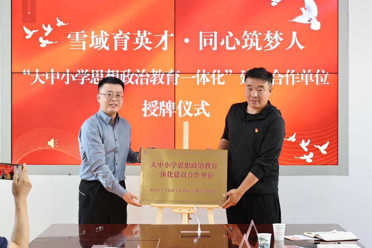 兰昊随后分别向昌都市教育局和昌都市实验小学授予了合作牌匾,并赠送了我院编写的相关教学指导方案和研究书籍。学院青年教师宁悦、张玉杰受聘首批市大中小学思政教育一体化建设项目指导专家。