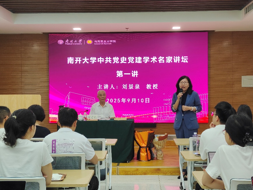 刘景泉教授从学习中共党史的必要性和重要性出发,系统阐述了党的四个历史阶段,深入解读党团结带领人民实现从“站起来、富起来”到“强起来”的伟大飞跃。他强调,党史研究要牢牢把握马克思主义中国化时代化的历史脉络,坚持党的初心使命,树立正确的党史观和大历史观,旗帜鲜明反对历史虚无主义,并在宽广的历史坐标中理解党的奋斗历程。刘教授还向师生推荐多部经典著作,鼓励大家静心研读、坚定信念、涵养学术。