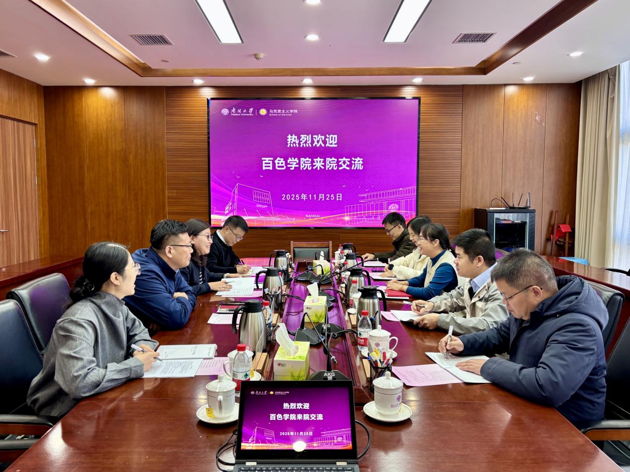 交流会上,崔满顺书记详细介绍了我院在学科建设、师资培养、科学研究及思政课实践模式建设方面的成果与经验。刘芳校长对学院的热情接待表示感谢,她介绍了百色学院的历史传承与区位特色,分享了百色学院所坚持的区域性、开放性、生态性的办学特色与优势,希望借此机会,在思政课改革创新、学科建设等方面向首批全国重点马院学习,并在未来争取依托学院当地民族资源、红色资源开展师资互访、国情调研等进一步合作。