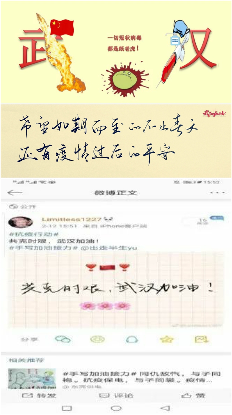 笔墨传情,温暖人心,我院学生会张兆涵、董晓乐、张千一、聂小敏,新媒体中心张子琪,院研究生会王姣等同学通过书写祝福语,制作抗疫宣传图片,录制视频等形式表达良好祝愿,祈福武汉早日战胜病毒。